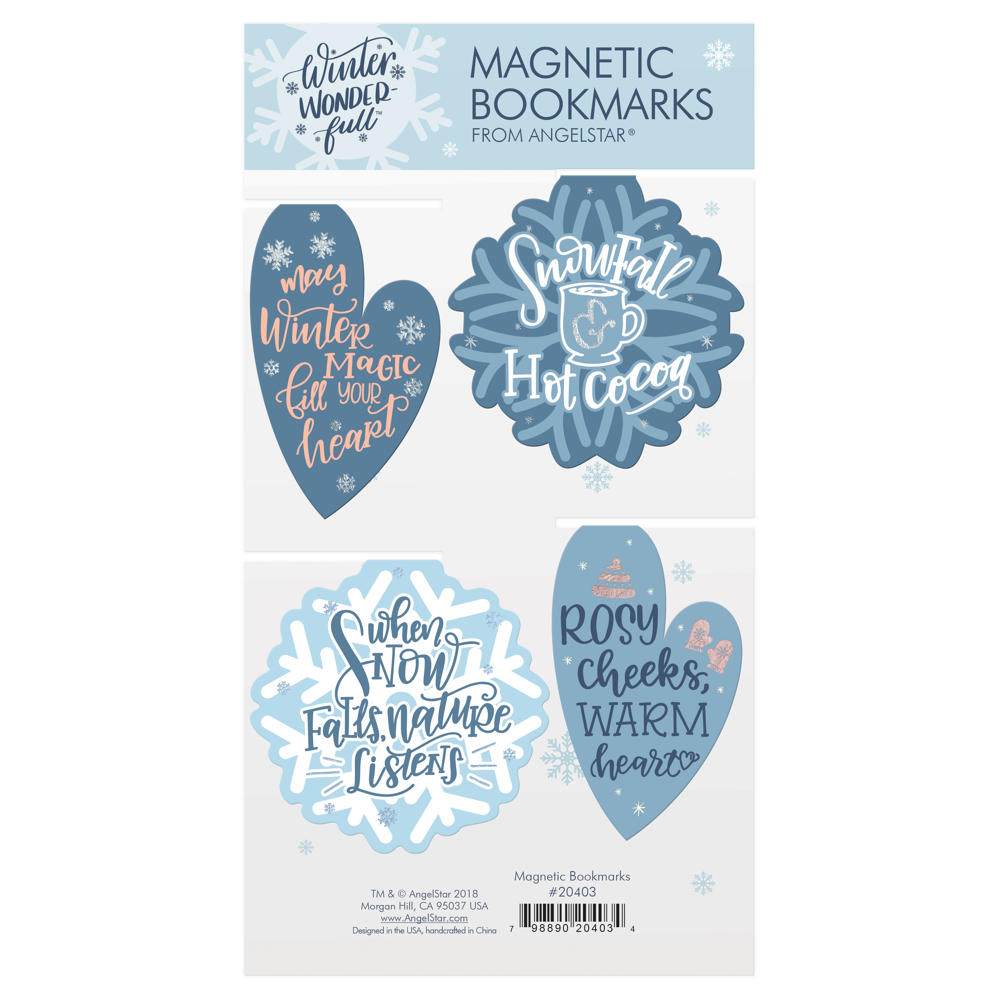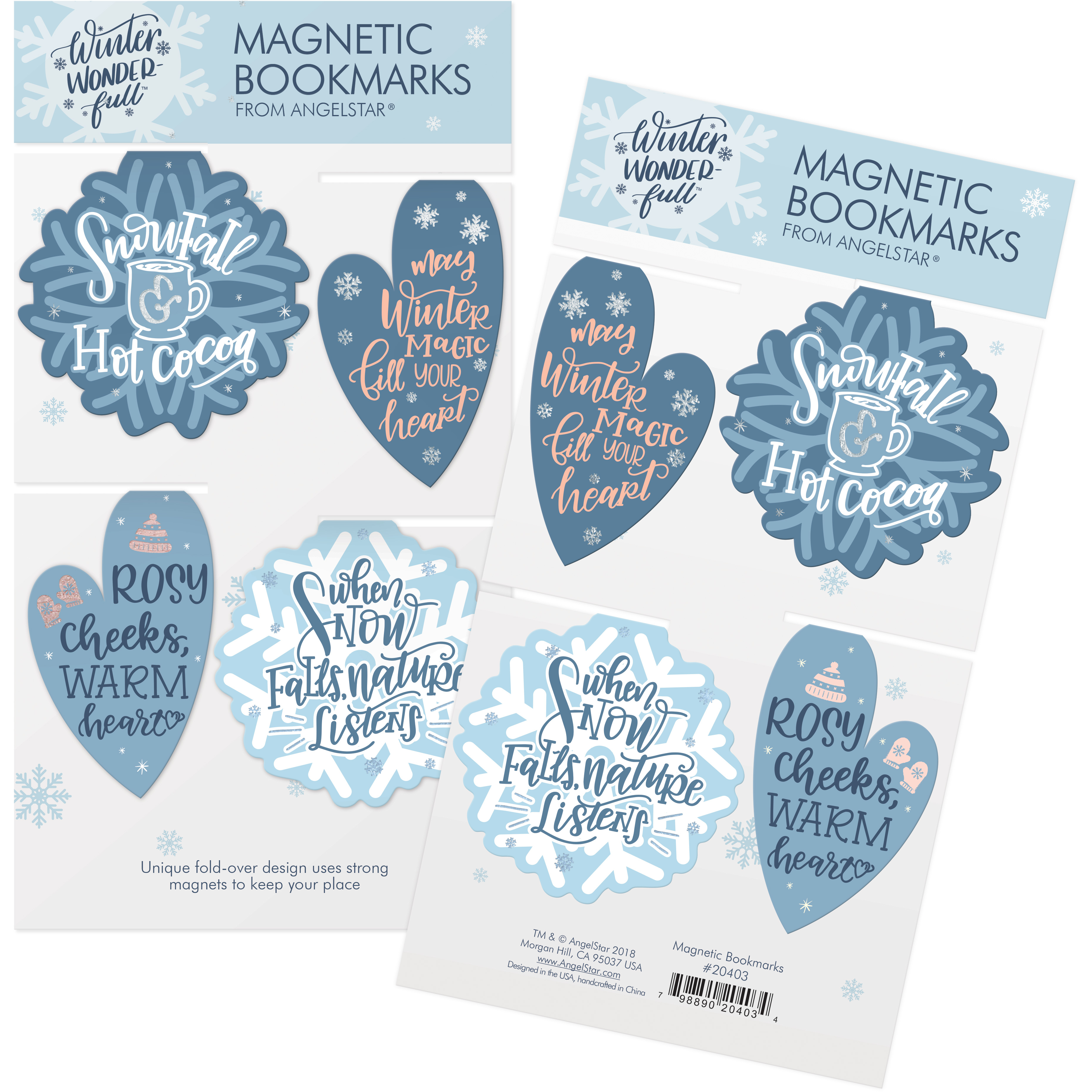 The Hearts and Snowflakes Magnetic Bookmarks includes 4 bookmarks adorned with winter sentiments and utilizes a unique fold-over design.