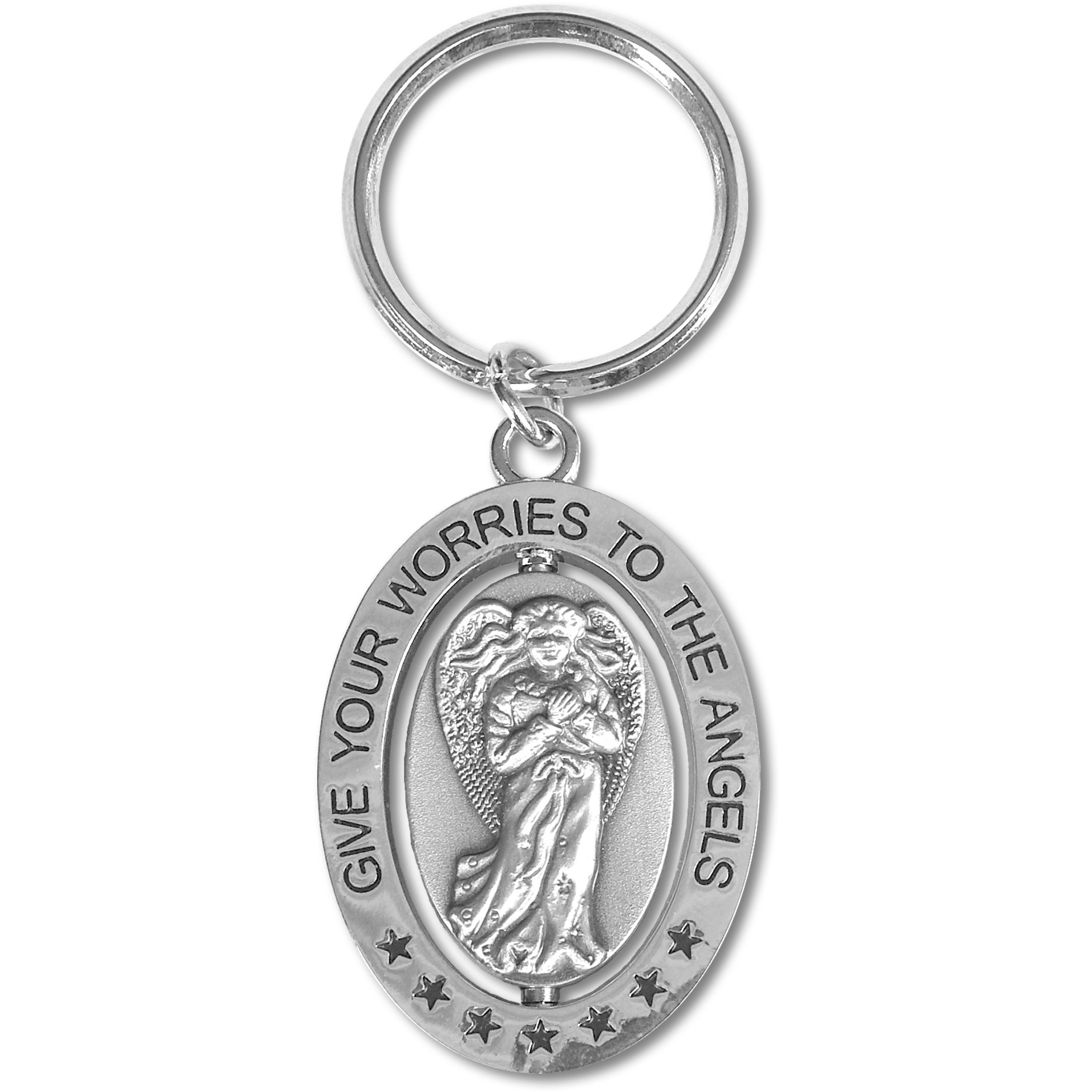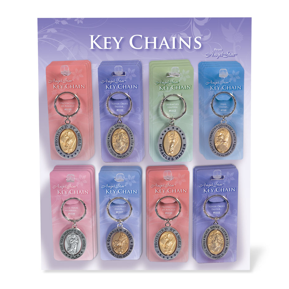 Gift our heavenly Key Chains to someone in need of their very own Guardian Angel. Our unique Key Chains have an Angel in the center that spins freely. Each Key Chain is inscribed with a protective inspirational saying and makes a thoughtful gift for anyone on your list. You will receive 8 each of Protected by Angels and Never Drive Faster, 4 each of Miracles Happen, Hope-Courage, Give your Worries and Guardian Angel. Free Display is one time per location.